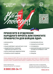 Под девизом «всё для победы!» народный фронт просит поддержать бойцов на передовой СВО и мирных жителей новых и приграничных регионов. На портале мы рассказываем, как перечислить деньги, где принимают вещи, что требуется военным и жителям ЛНР, ДНР, Херсонской, Запорожской, Курской и Белгородской областей. Здесь же можно узнать, как грузы доставляются адресатам. | |